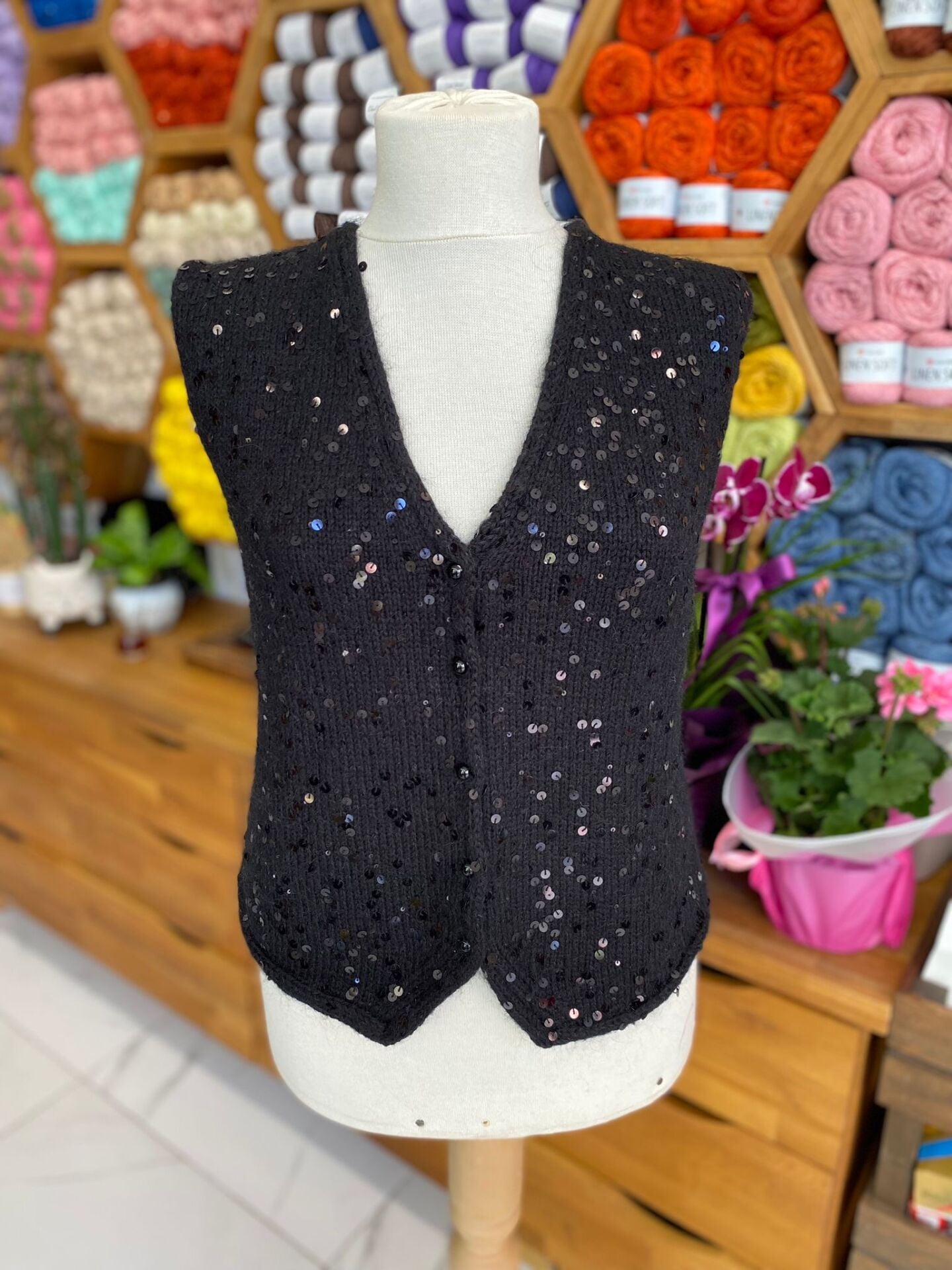El işçiliğinin zarafetini modern şıklıkla buluşturan siyah pullu el örgüsü yelek, stiline iddialı bir dokunuş katmak isteyenler için tasarlandı. Işığı her açıdan yakalayan pullu dokusu sayesinde hem günlük kombinlerde hem de özel davetlerde dikkat çekici bir görünüm sunar.